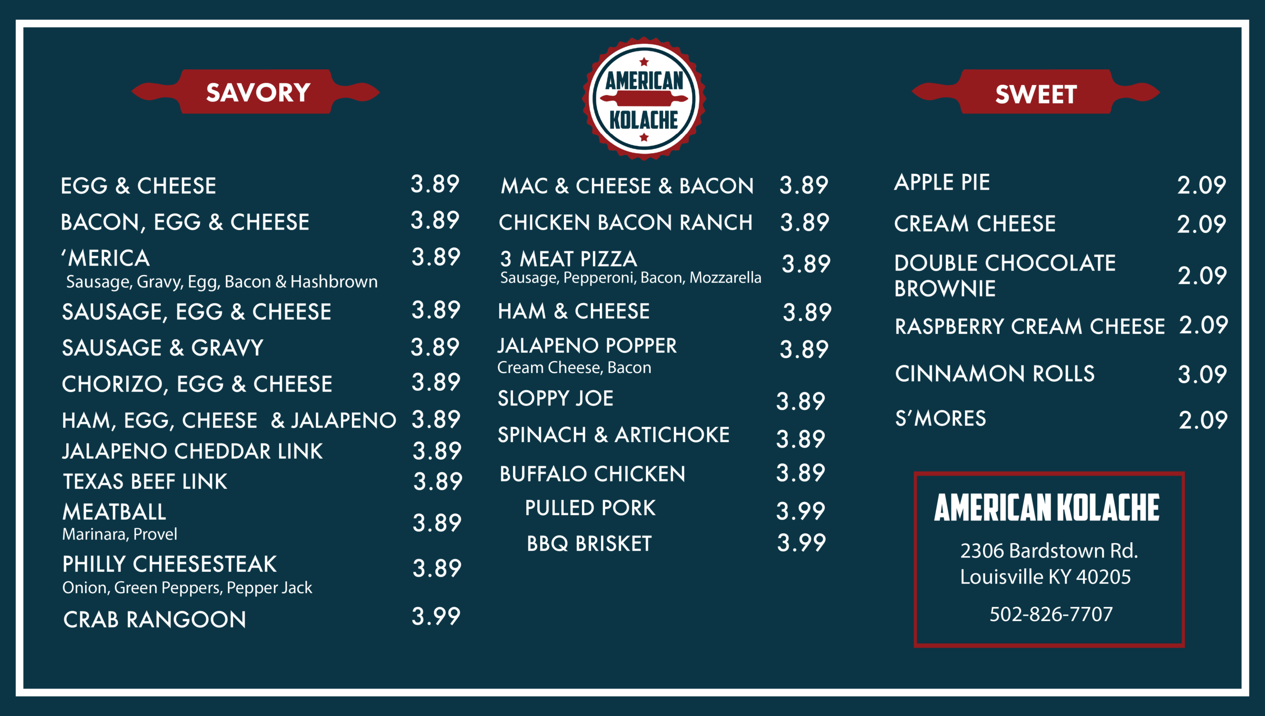 American Kolache Menu Order Online | Louisville ORDER CATERING Got questions about the menu? Call or email us at the contact information below with questions! Louisville 502-826-7707